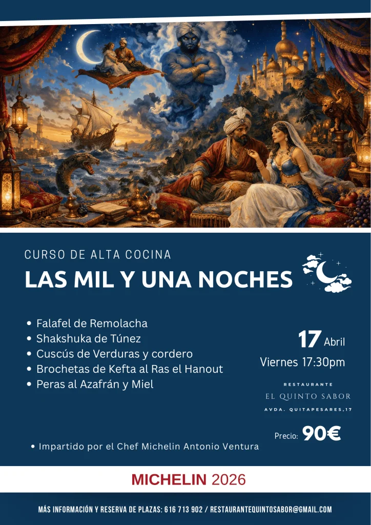 Curso Alta Cocina Especial Las Mil y Una Noches presencial el Viernes 17 de Abrilde 2026, a partir de las 17:30h, en El Quinto Sabor. Crearemos paso a paso recetas de Oriente de nuestro chef Antonio Ventura. Incluye ingredientes premium, dossier de receta y degustación. Plazas muy limitadas: reserva ya y descubre el amor por la cocina de la mano de un chef Michelin.